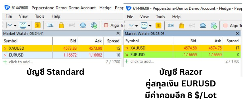 • ข้อแตกต่างกัน จะเป็นในส่วนของการเทรดคู่เงิน (Forex) หากเทรดคู่เงินในบัญชี Razor Spread จะต่ำกว่า Standard อยู่โดยประมาณ 10 จุด และมีการคิดค่าคอมมิชชั่น (ค่าคอมมิชชั่น ของบัญชี Razor ใน MT4/5 และ TradingView ค่าคอมมิชชั่นอยู่ที่ 8 $ ต่อ 1 lot ส่วน cTrader อยู่ที่ 6 $ ต่อ 1 lot)