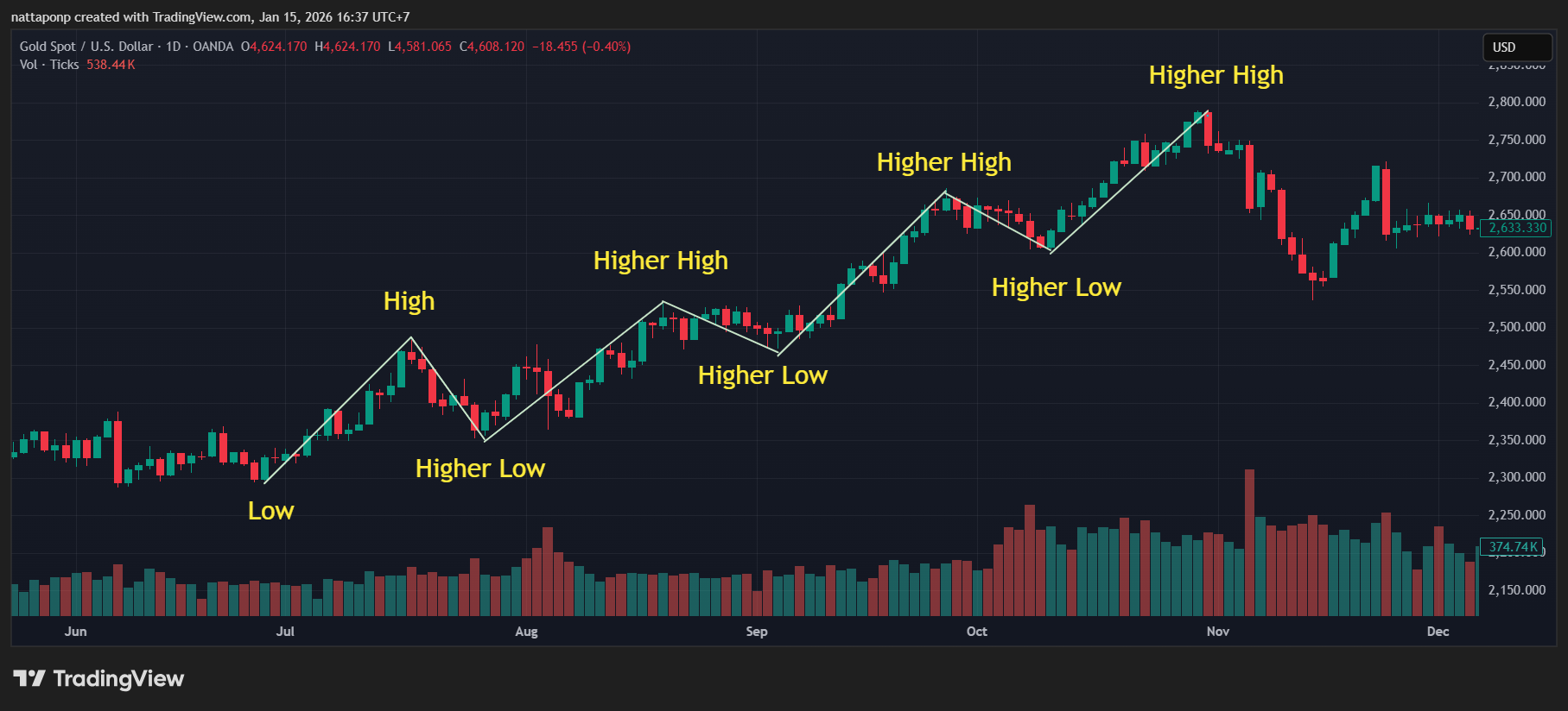 แนวโน้มขาขึ้น กราฟจะทำจุดสูงสุดใหม่ (new high) อยู่เสมอ ในขณะที่จุดต่ำสุดก็จะยกตัวสูงขึ้น ที่เราเรียกกันว่ายก High ยก Low ซึ่งถ้ากราฟเป็นแนวโน้มขึ้น การเทรดของเราจะเทรดหน้า Buy