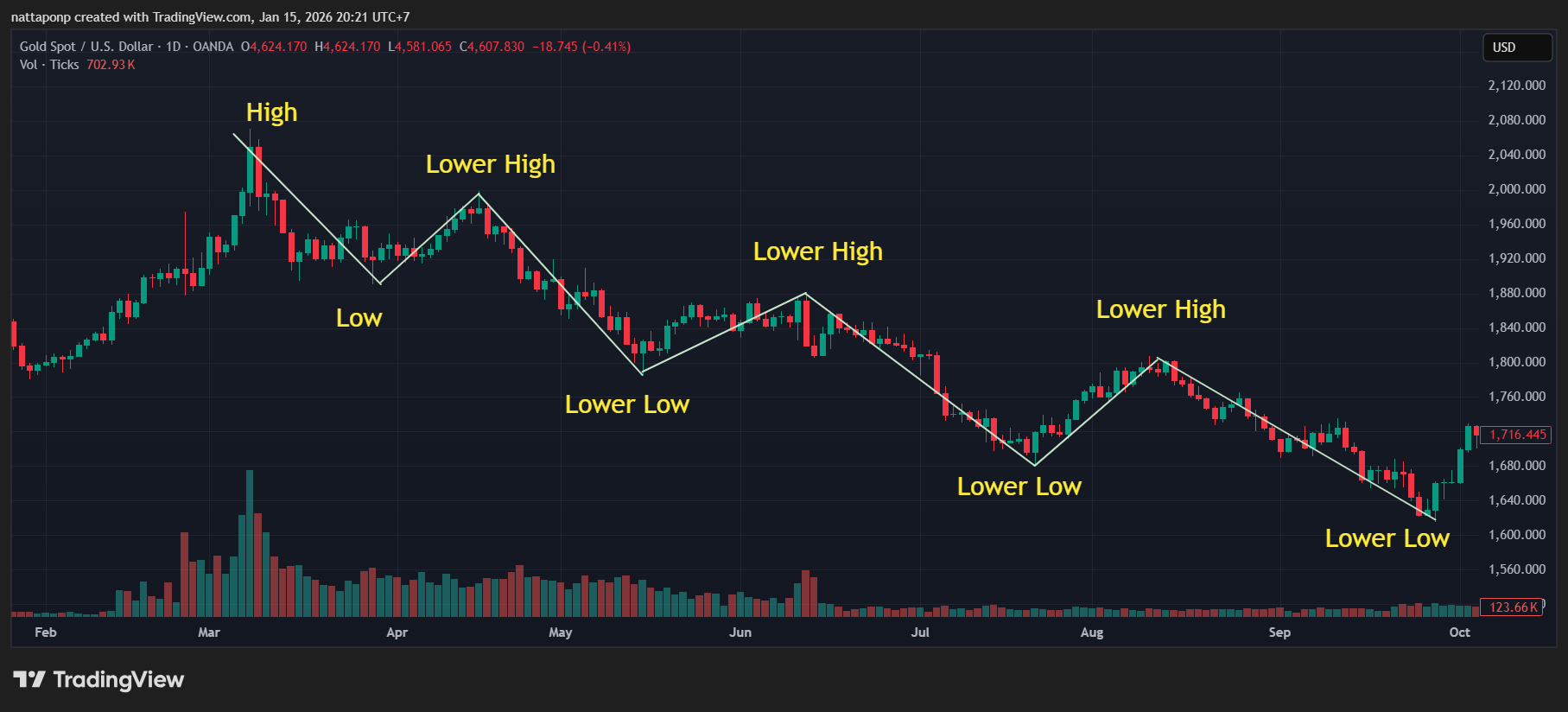 แนวโน้มขาลง กราฟจะทำจุดต่ำสุดใหม่ (new low) อยู่เสมอ ในขณะที่จุดสูงสุดก็จะต่ำลงด้วย ที่เราเรียกกันว่า High ต่ำลง Low ต่ำลง ซึ่งถ้ากราฟเป็นแนวโน้มลง การเทรดของเราจะเทรดหน้า Sell