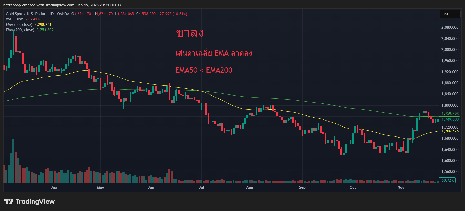ขาลง – EMA ชันลง คล้าย ๆ กับการเดินลงภูเขา หรือถ้าใช้ EMA 2 เส้น ขาลง EMA สั้นจะอยู่ใต้ EMA ยาว เช่น EMA50 < EMA200