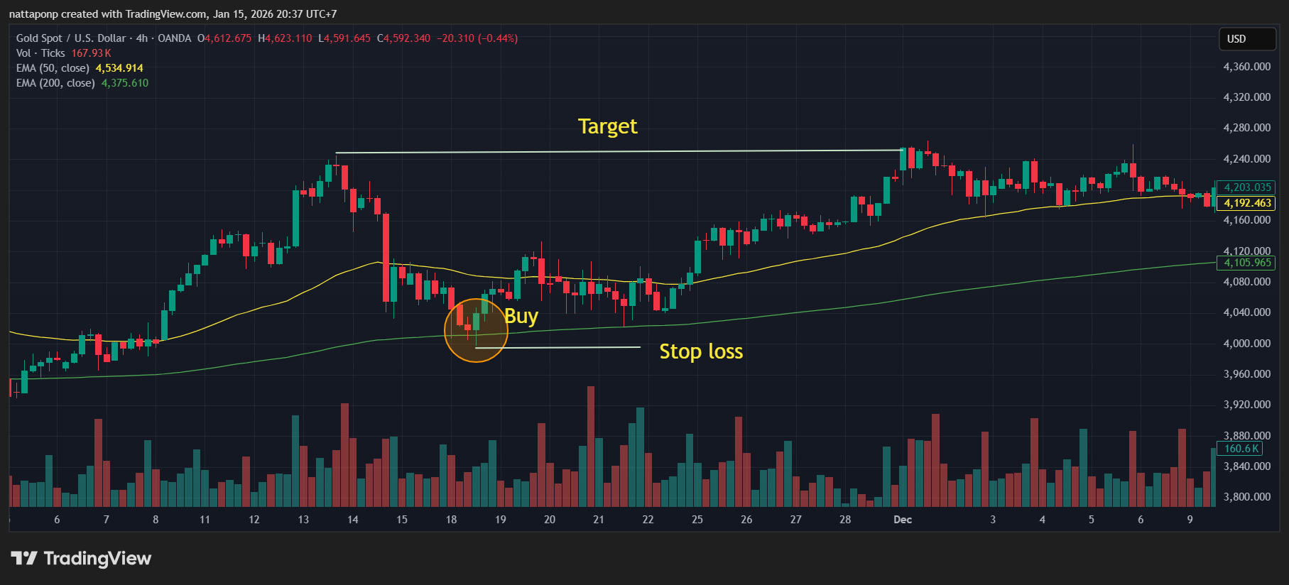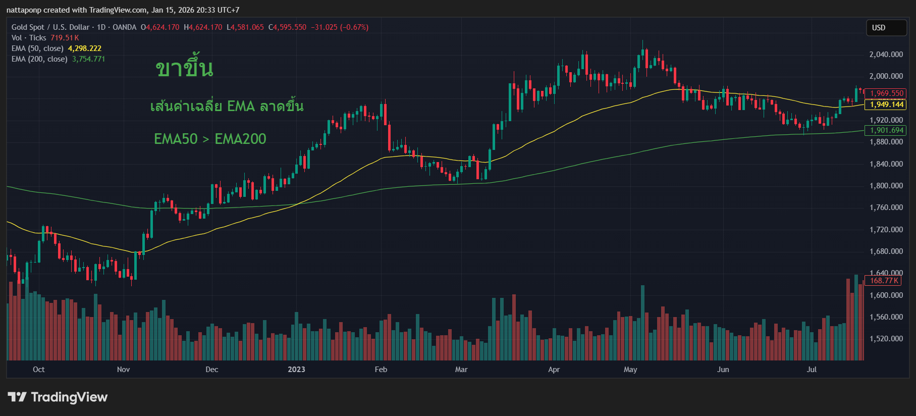 แนวโน้มเป็นขาขึ้น สังเกตได้จาก EMA50 (สีเหลือง) > EMA200 (สีเขียว) โดยราคาได้ลงมาทดสอบ EMA200 และเกิด Price action ประเภท Bullish Engulfing ซึ่งเป็นจังหวะในการเปิด Buy 4000 (วงกลมสีส้ม ตามรูป) วาง Target แนวต้านบริเวณ 4250 และวาง Stoploss ที่ Low ของแท่ง Bullish Engulfing ที่บริเวณ 3995
